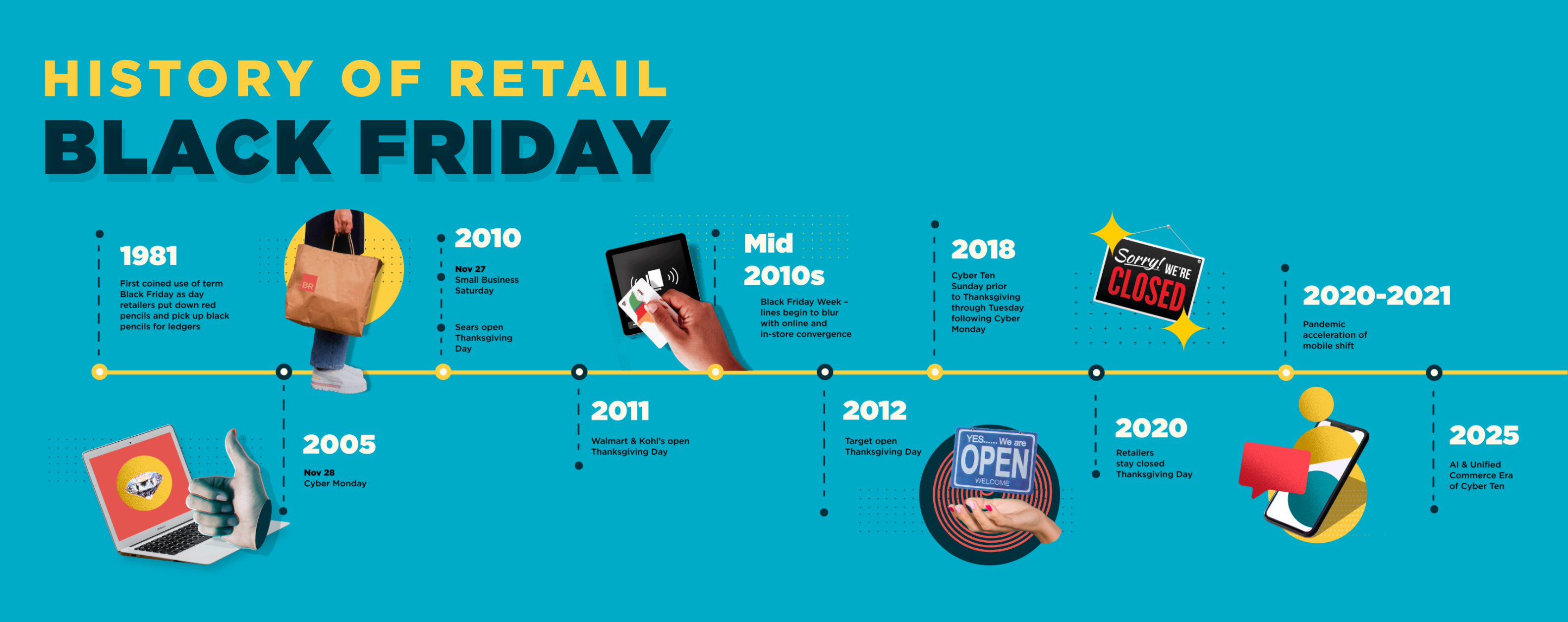 While Black Friday began as a singular in-store event after Thanksgiving, the further extension of retail sales took advantage of the online shopping frenzy, opening up the window the Sunday before Thanksgiving and concluding the Tuesday after Cyber Monday – now terming the promotional window “Cyber Ten.”